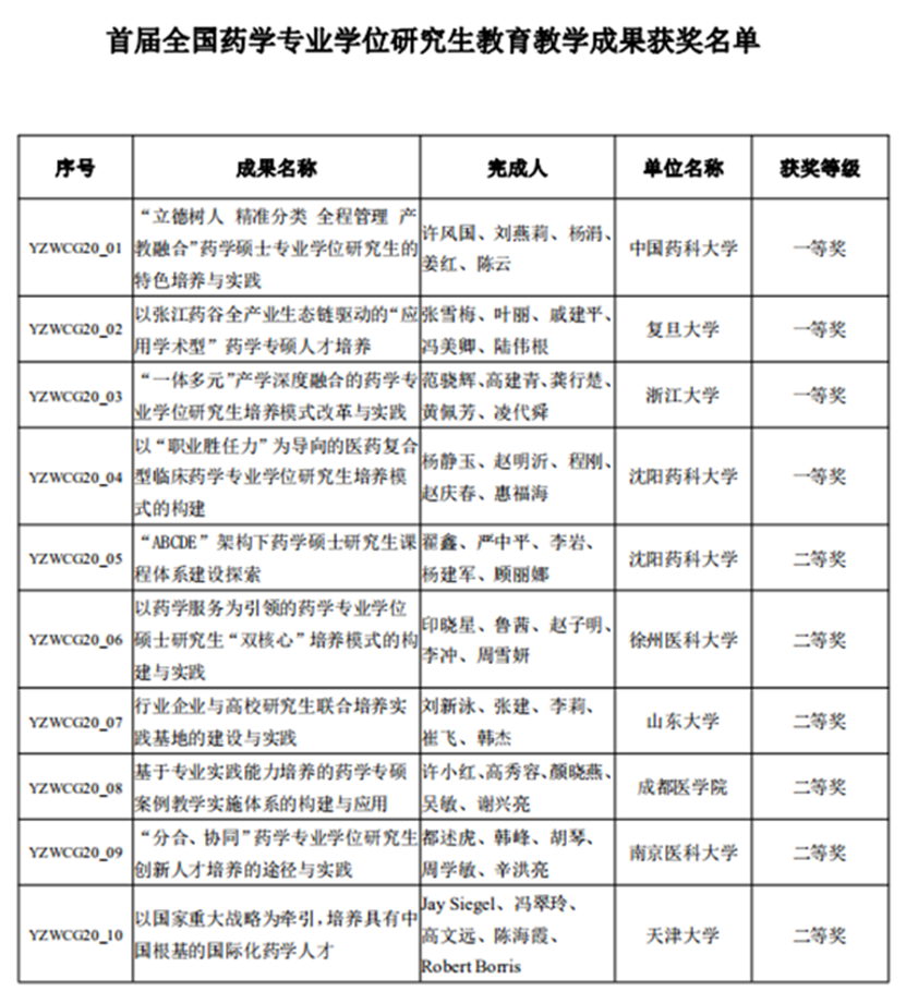 为深化研究生教育教学改革,促进药学专业学位研究生培养质量的持续提高,全国药学专业学位研究生教育指导委员会在2020年7月启动了首届全国药学专业学位研究生教育教学成果奖申报,我校推荐申报的药学专硕案例教学荣获二等奖。