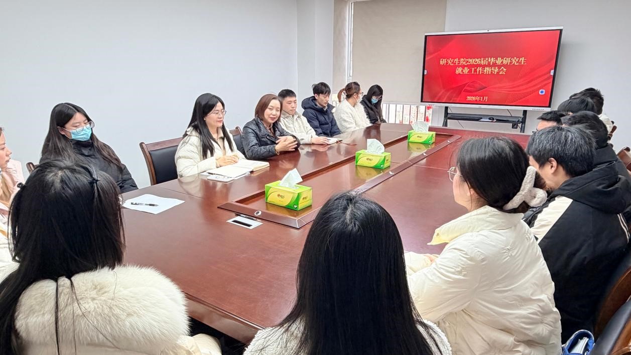 为进一步推进2026届研究生就业指导工作,助力毕业生精准把握就业形势、树立科学的就业观念,研究生院于1月14日在行政楼423会议室组织举行了2026届毕业研究生就业指导会。研究生院党委书记贾春水、学生科科长莫炼及各学院毕业生代表参会。